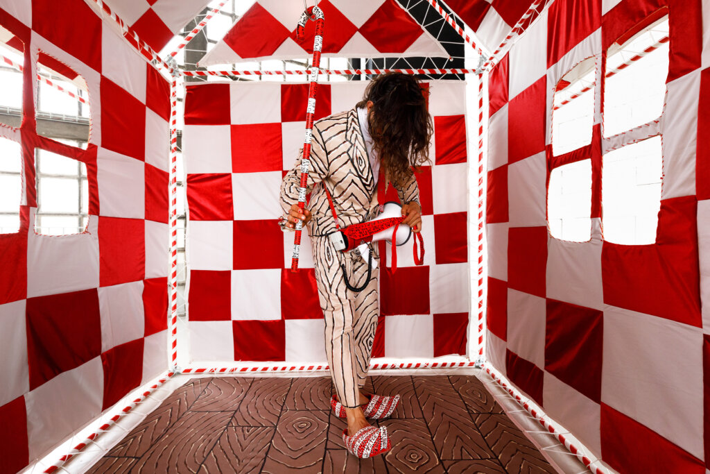 Il s’articule grâce à la rencontre de multiples médiums : photographie, performance, peinture, fabrication de costumes et d’accessoires. Ces éléments se rassemblent pour former une enveloppe propice au déclenchement de mes performances »