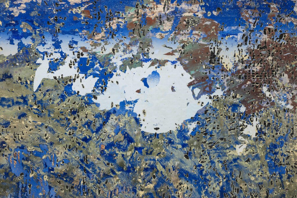 En multipliant les matériaux et les techniques sur de vastes panneau travaillés aussi bien au sol que sur un mur, elle crée des œuvres abstraites où des strates de matières sont grattées, et où l’image émerge à force de retraits.