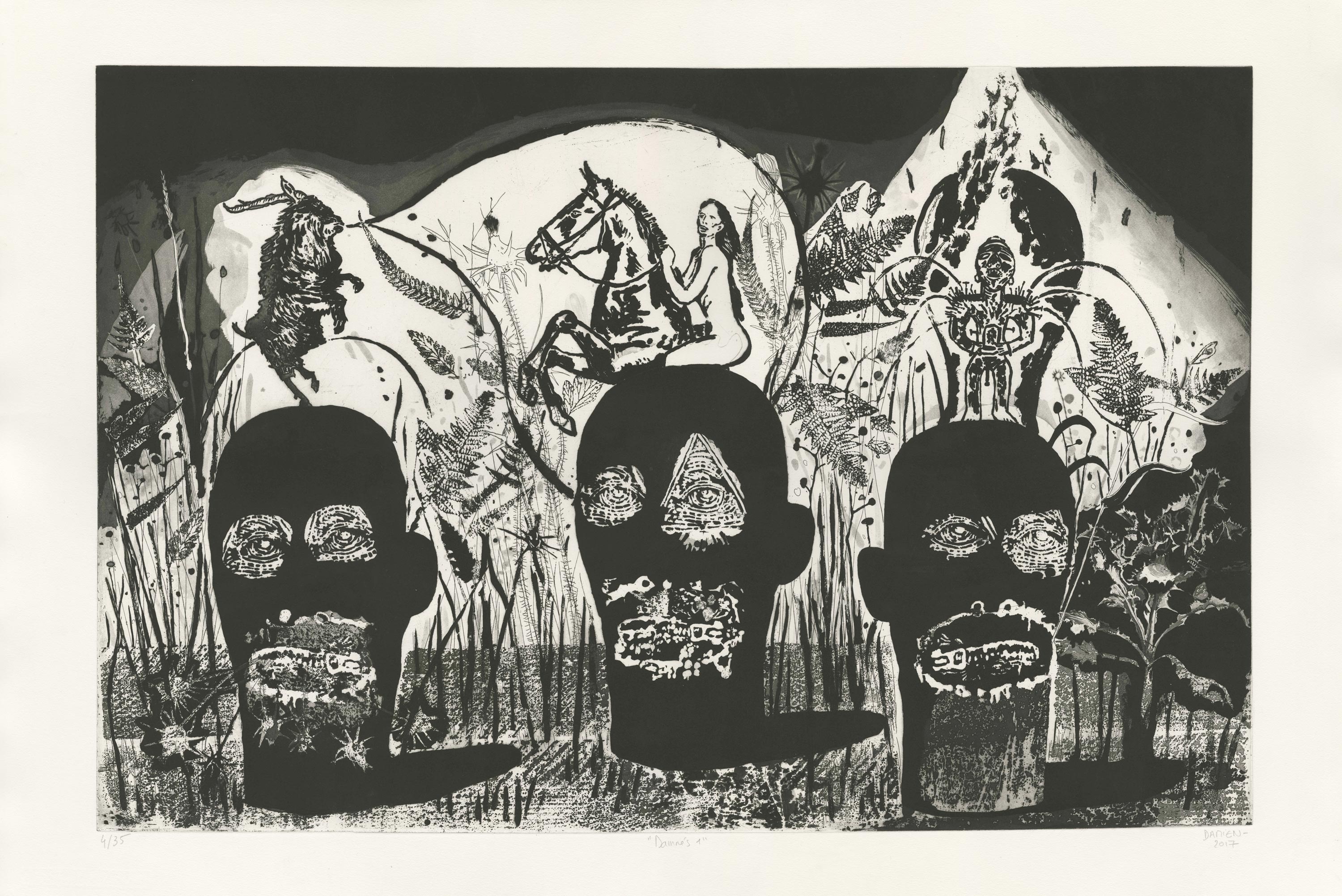 Parmi les artistes majeurs de sa génération, Damien Deroubaix est l’un des rares à placer conjointement au centre de sa pratique la gravure, la peinture et la sculpture, qu’il réinvente par des circulations incessantes entre ces différents médiums. Iconoclaste, allégorique, son art reste hanté par la musique death metal découverte à l’adolescence. Il est aussi empreint de références à l’histoire de l’art, aux œuvres d’illustres prédécesseurs ou d’immédiats contemporains, maîtres de la peinture et de la gravure ou figures de la contre-culture.