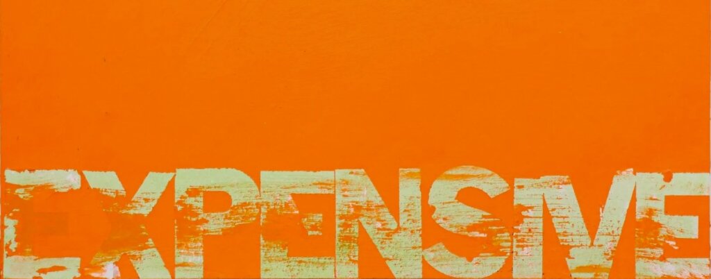 Expensive, titre d’une acrylique sur papier de Sylvie Fanchon (diplômée des Beaux-Arts de Paris en 1980), donne le ton de la première exposition posthume de l’artiste à la galerie Maubert, Paris. Le lettrage, qui s’installe sur la totalité de la base de la surface peinte, est dessiné au pochoir dans la réserve d’un papier légèrement coloré. Le mot est entaché par les traces orange de l’aplat monochrome. On imagine le plaisir de l’artiste à répandre la peinture jusque dans le mot, la faire baver dans son geste de retrait du pochoir. On comprend le refus d’une perfection qui serait incarnée par une exécution lisse et léchée, tracée au cordeau. Le caractère assumé du geste de peindre, ses éventuelles traces, bavures et écarts est caractéristique de la conduite de l’artiste Sylvie Fanchon, son refus d’identifier sa peinture à un illusionnisme.