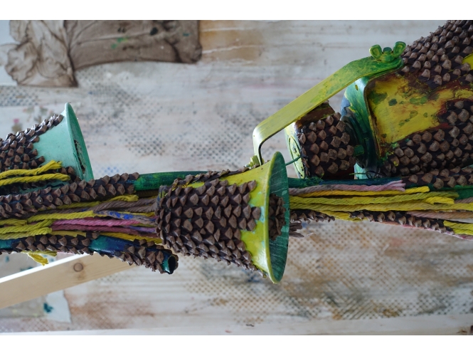 « Un vert pas très frais tendance vert-de-gris domine dans l’œuvre multicolore de Thomas Buswell (lauréat du prix Thaddaeus Ropac pour les Amis des Beaux-Arts de Paris en 2024) . Il apparaît par touches expressionnistes denses sur des tubes métalliques ou plus diffuses sur des serpillères. Presque partout, cet agent ambigu dépose sa marque invasive. Il est comme ces vergerettes, qui lorsqu’on a appris à les différencier des pâquerettes, s’infiltrent dans tous nos regards à la campagne et le long des voies de chemin de fer. » […]